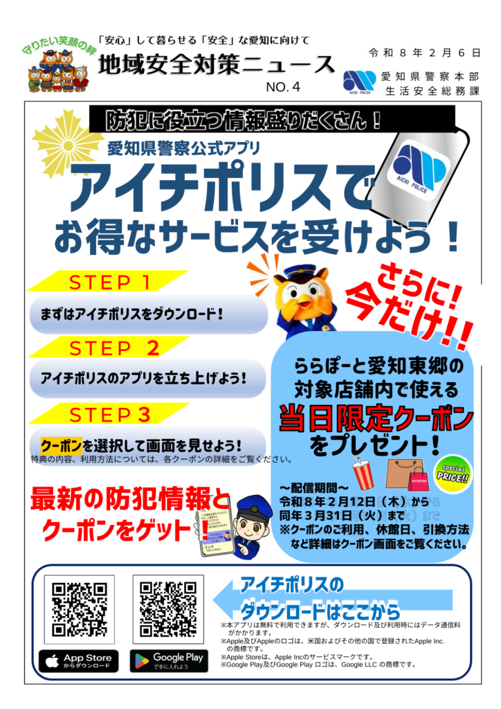 アイチポリスでお得なサービスを受けよう! 2026 2/12 情報提供 【暮らし】地域と安全の情報ナビ 2026年2月12日 情報提供 【暮らし】地域と安全の情報ナビ よかったらシェアしてね! URLをコピーしました! URLをコピーしました! くろーばー結び西尾店が中京テレビに取材されました! この記事を書いた人 furui 関連記事関連する記事はまだ見つかりませんでした。 コメント コメントする コメントをキャンセルコメント ※ 名前 ※ メール ※ サイト Δ このサイトはスパムを低減するために Akismet を使っています。コメントデータの処理方法の詳細はこちらをご覧ください。